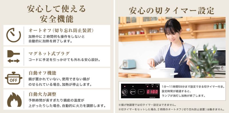 切り忘れ防止装置やマグネット式プラグ、自動オフ機能や自動火力調整、切タイマー設定など、安心して使用できる多様な機能を搭載しております。
