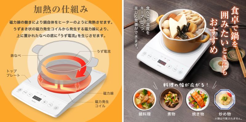 「うず電流」技術によって、最適な食べごろを維持します。うずまき状の磁力発生コイルから生じる磁力線が鍋底に“うず電流”を生み出し、それが鍋底の金属抵抗によって熱に変わり、直接鍋に熱を加えます。これにより、熱を無駄にせず温め、鍋料理等を長時間、食べごろの温度に保持することができます。