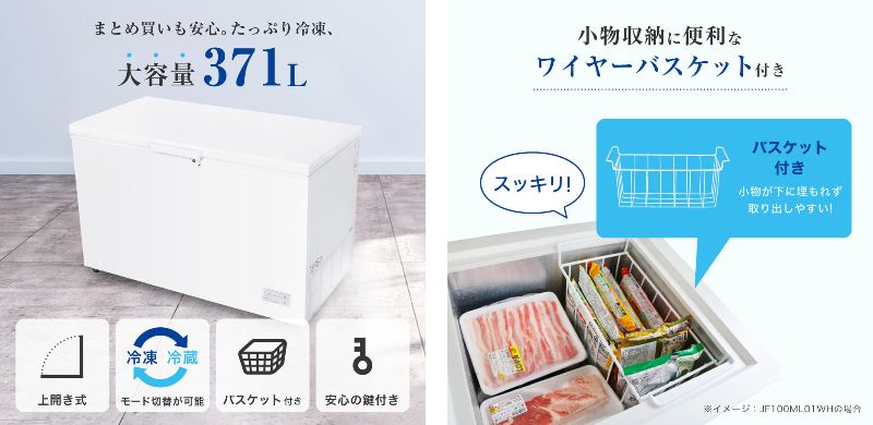 371Lと大容量なので、多様な食品を保存することができます。特売日に買い溜めした食材、ふるさと納税の返礼品、大量に作り置きした料理、釣り用の氷やえさ、釣れた魚など、普段使いの冷凍庫とは別の専用冷凍庫として、2台目にぴったりな製品です。また、付属のワイヤーバスケットにより、個包装の冷凍食品などの小物も底に埋もれずに簡単に取り出せるため、食品を整理整頓してスッキリと保存することができるので、食材をたっぷり保存することができます。