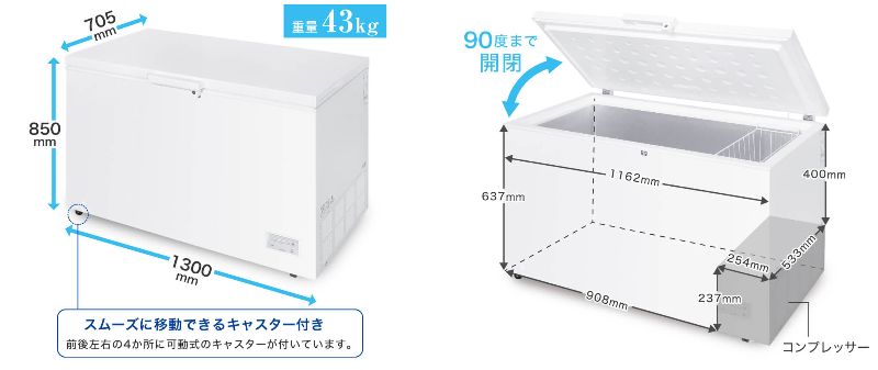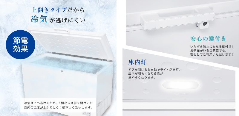 冷気は温かい空気よりも密度が高い為、下へ逃げる特性があります。その為、上開き式の扉を採用している本製品は、扉を開けても庫内の温度が上がりにくく、保存している食品を効率よく冷やすことができます。また、扉はお子様がいるご家庭でも安心してご利用いただける鍵付きで、扉を開けると自動で点灯する庫内灯も備えており、使いやすさに配慮した仕様としております。