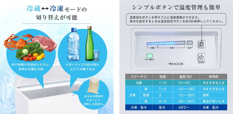 「冷蔵」と「冷凍」の切り替えができるので、肉や海鮮、野菜やペットボトルや酒瓶など大きいサイズの飲み物を保管することができます。また、冷凍は「弱」「普通」「強」「急冷」の4段階に対応しており、温度設定ボタンで簡単に切り替えることができます。