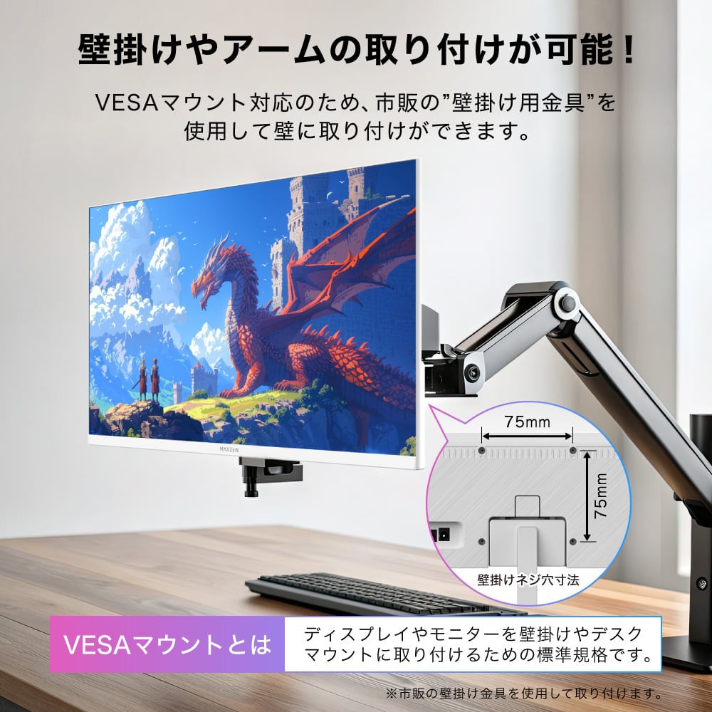 画面は見やすく前後にVESAマウント対応で壁掛けやアーム取り付け可能