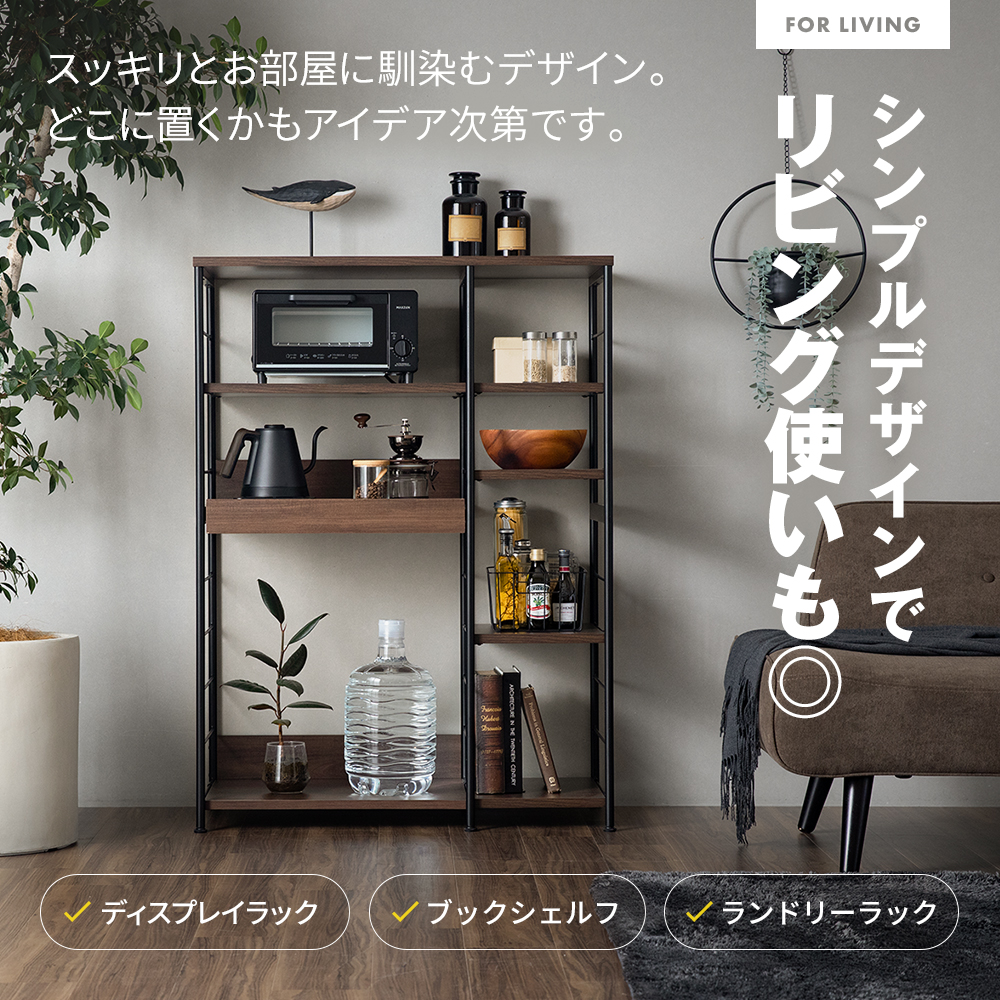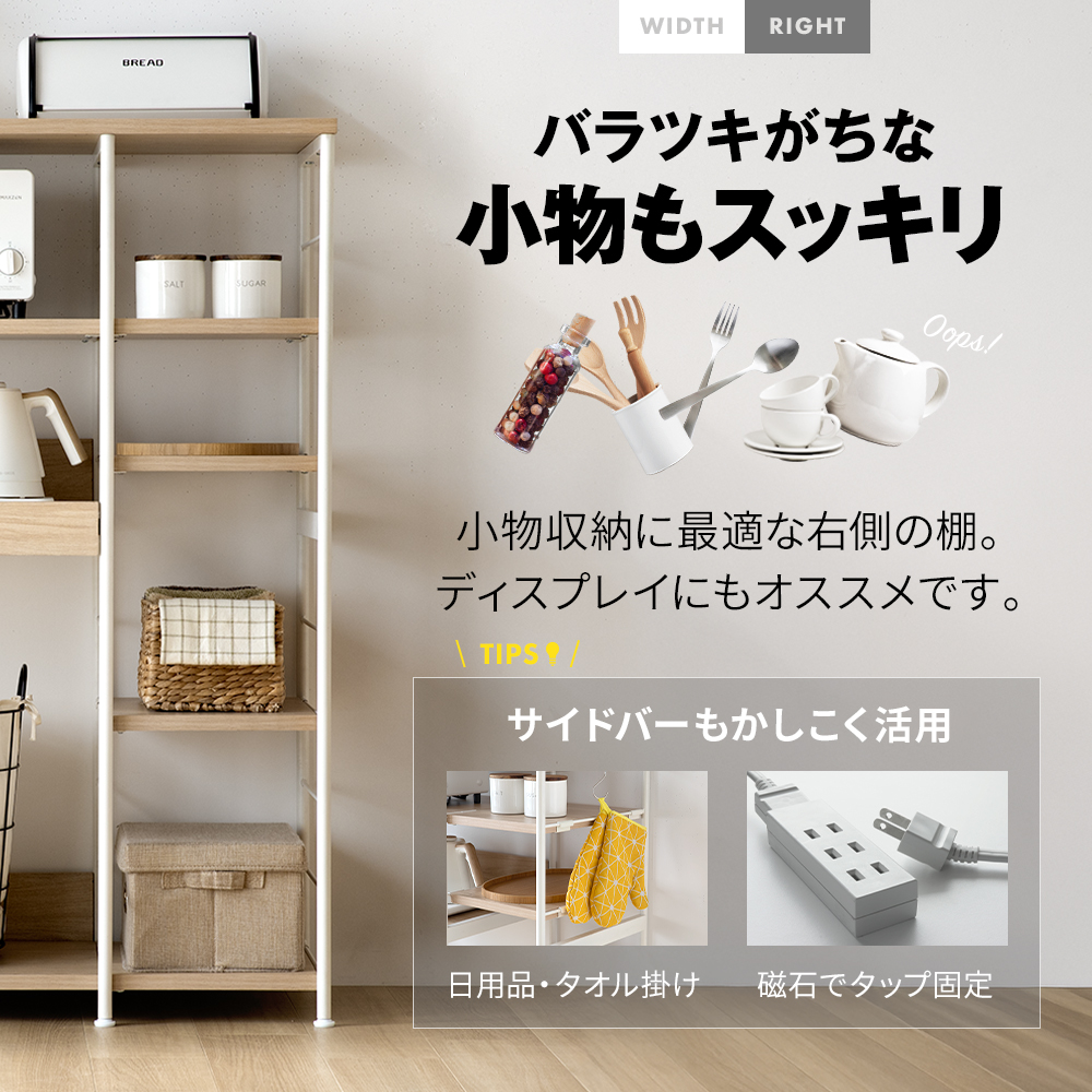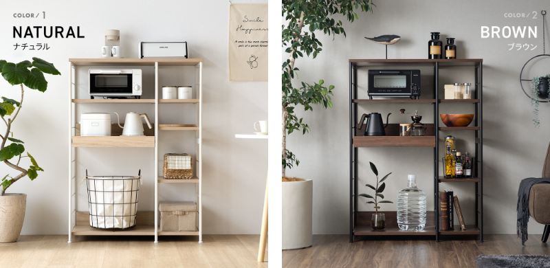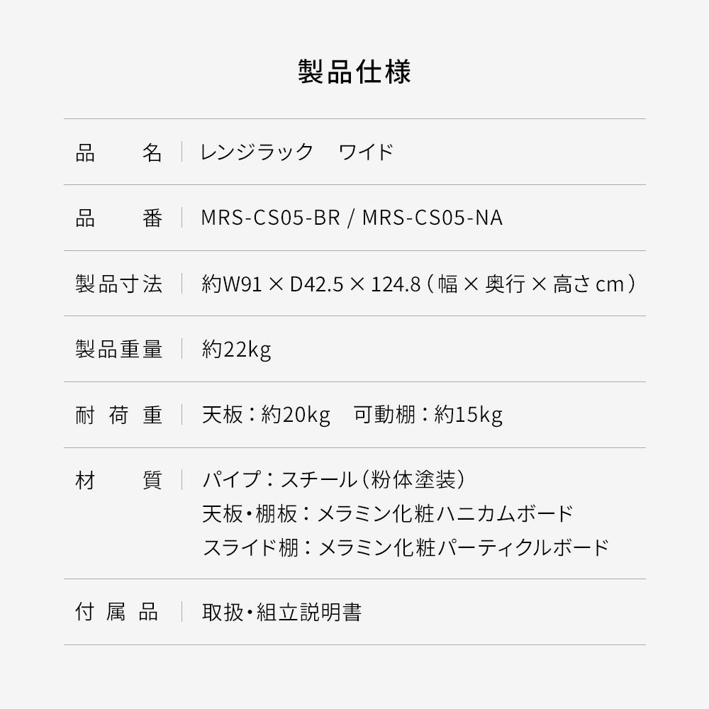 幅約60cmと30cmを組み合わせた幅91cm&大小計4枚の可動棚で収納力抜群、錆対策のパウダーコーティングや汚れ対策のメラミン化粧板なども備えたワイドサイズのレンジラックを発売。