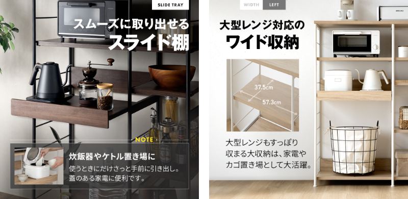 ケトルが置けるスライド棚と大型レンジ対応ワイド収納(約57×37cm)の左側