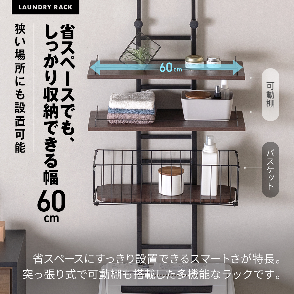 洗濯機の側面にも設置可能、省スペースでもできる幅60cm