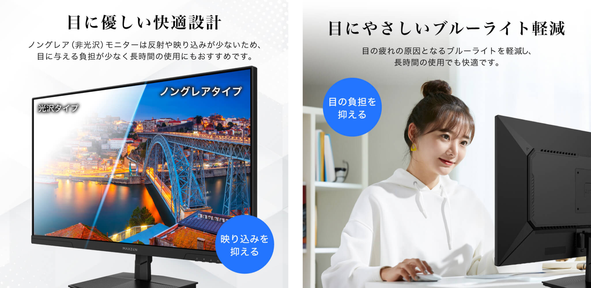 目に優しいノングレアとブルーライト軽減仕様