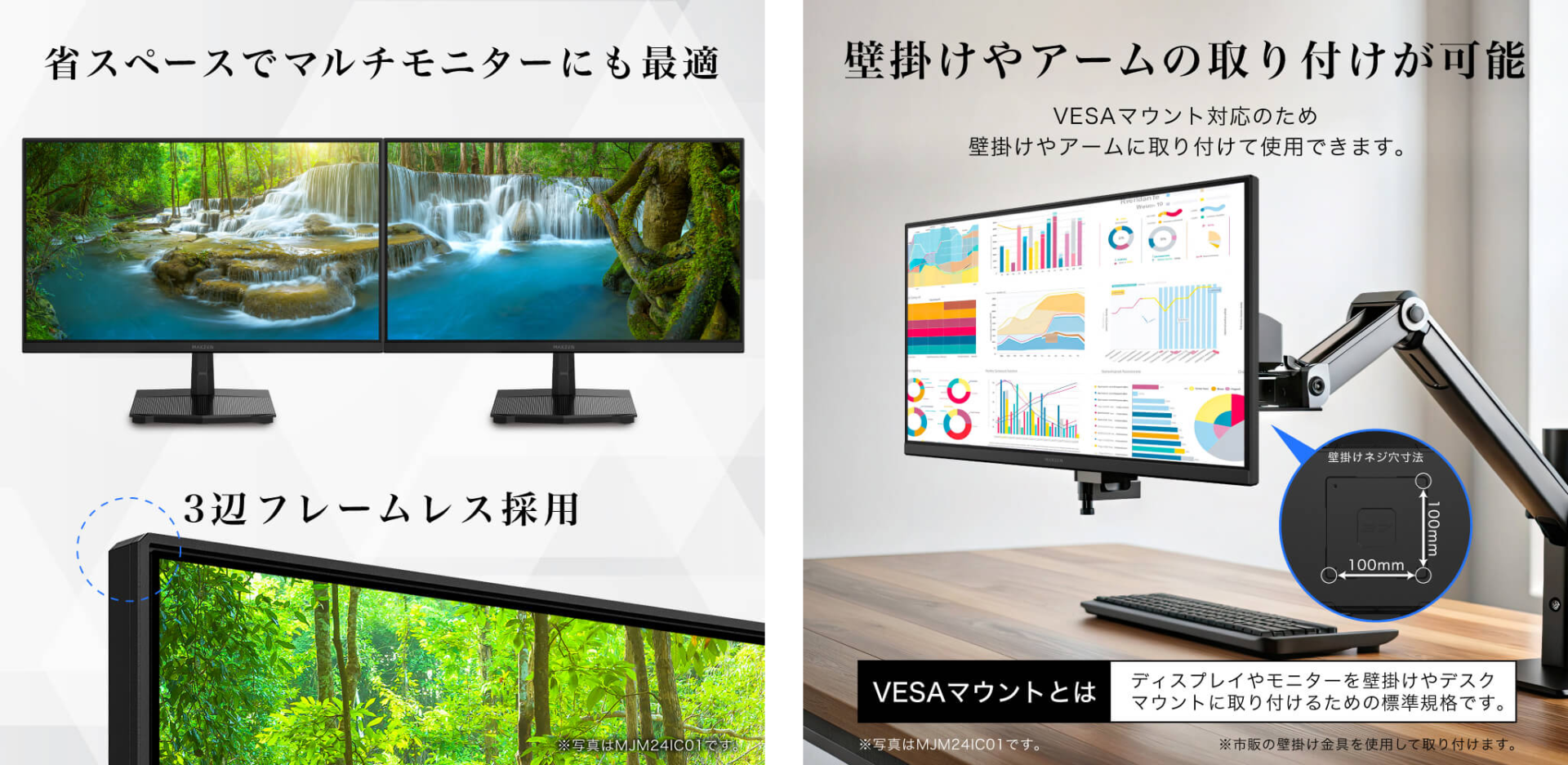 3辺フレームレスでマルチモニターにピッタリ、壁掛けやアームの取り付けも可能